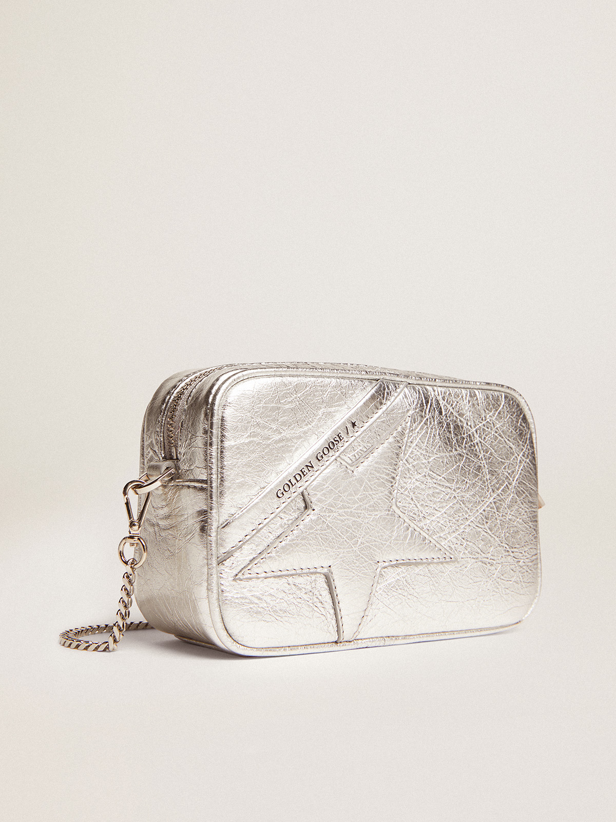 Create AccountVintage inspiration, metropolitan attitude. A versatile accessory that captures the classic design of camera bags and stands out thanks to its refined details – now also in a mini version. This model, in silver laminated leather with a wrinkled effect, features a tone-on-tone star. The silver-colored shoulder chain and the contrasting black logo that decorates the front complete the look.