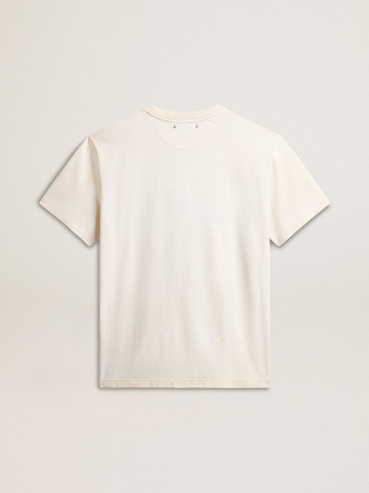 Create AccountA love story to our home, Marghera. Where everything began. Our latest collection reflects the spirit of our birthplace, its contrasts, industrial soul, and manufacturing landscapes, weaving together inspirations from both the vibrant energy of workwear and the refined essence of traditional tailoring. In aged white cotton jersey, this men's T-shirt features a gold "The Golden Club" watercolor print on the front. As a finishing touch, the worn details on the collar, edges and sleeves add a lived-in effect to the garment.