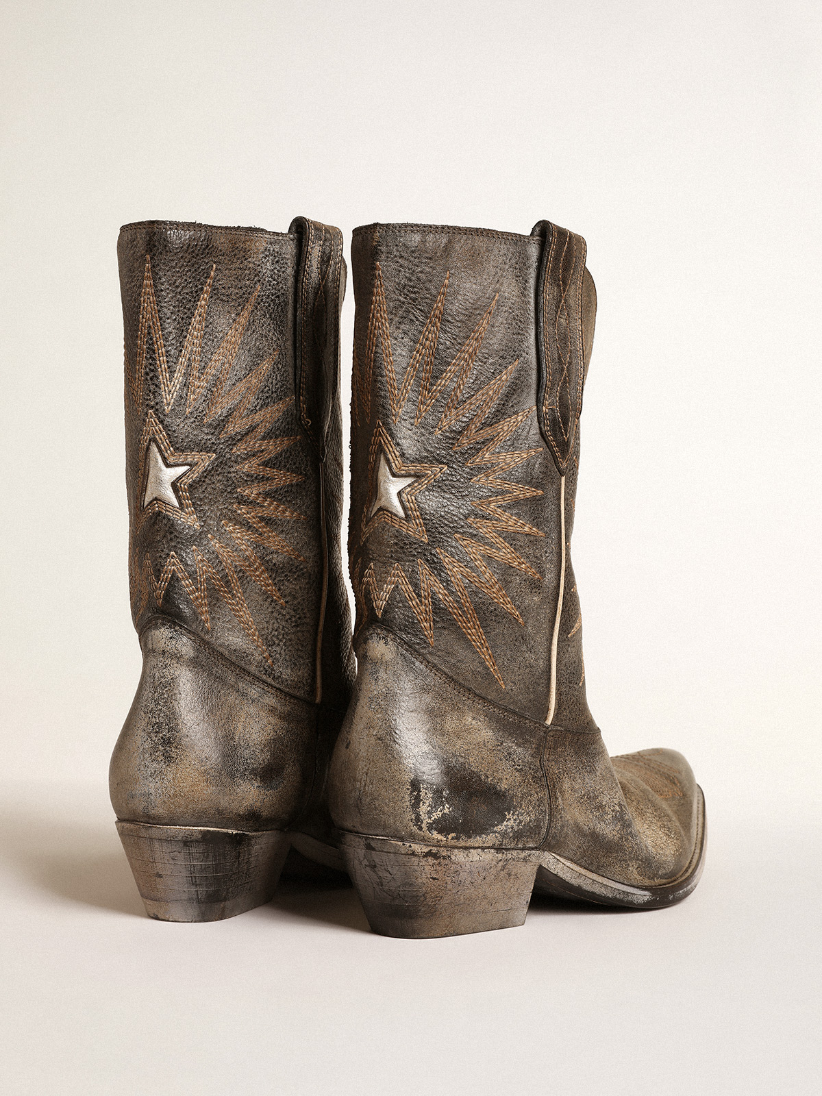 Créer un compteDu Texas à Venise : nos bottes Wish Star racontent notre voyage et nos passions, créant une association unique entre la tradition artisanale vénitienne et l’esprit western. Proposées dans une version basse pour femme, ces bottes se distinguent par une tige en cuir noir à l’effet usé rehaussée d’une étoile incrustée en cuir lamé argenté et par des broderies ornées de surpiqûres écrues contrastées sur la tige et le bout. Le liseré ocre et l’étiquette en métal doré, rehaussée de la signature Golden Goose gravée sur le talon, complètent le style.