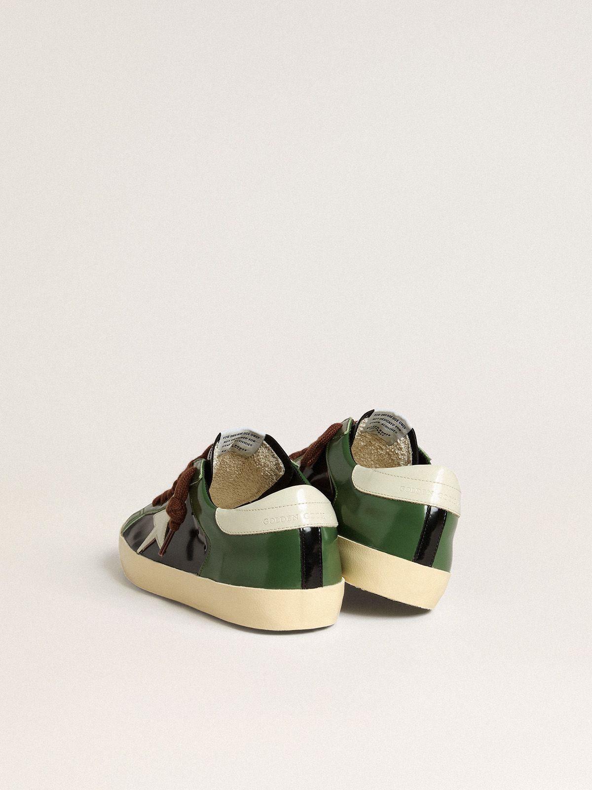 A timeless icon yet one that’s constantly evolving. At Golden, we love taking our classics and reworking them all the time, always from a new angle. These Super-Star, with a black laminated leather upper and green laminated leather inserts, feature a white leather star and heel tab. Brown laces add the finishing touch.