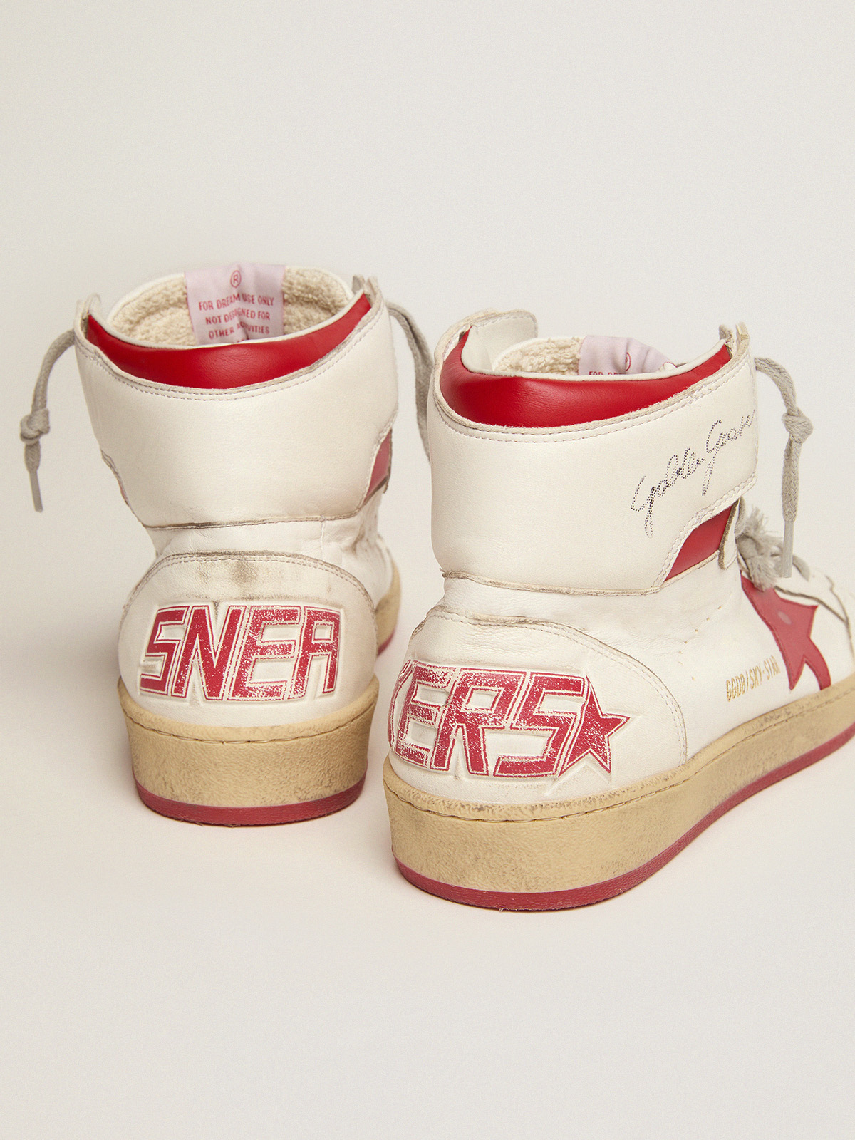 Create AccountA reinterpretation of high-top sneakers with an authentic soul: inspired by our Ball Star model, our Sky-Star sneakers have an American college vibe and a feel of the basketball scene of the Eighties. This model, with a white nappa leather upper, features a red leather star and the Golden Goose signature on the neck of the ankle, a reference to the childhood dream of having your favorite sneakers signed by basketball legends. The leather heel tab and sole, both in red, and ice-gray laces complete the look.