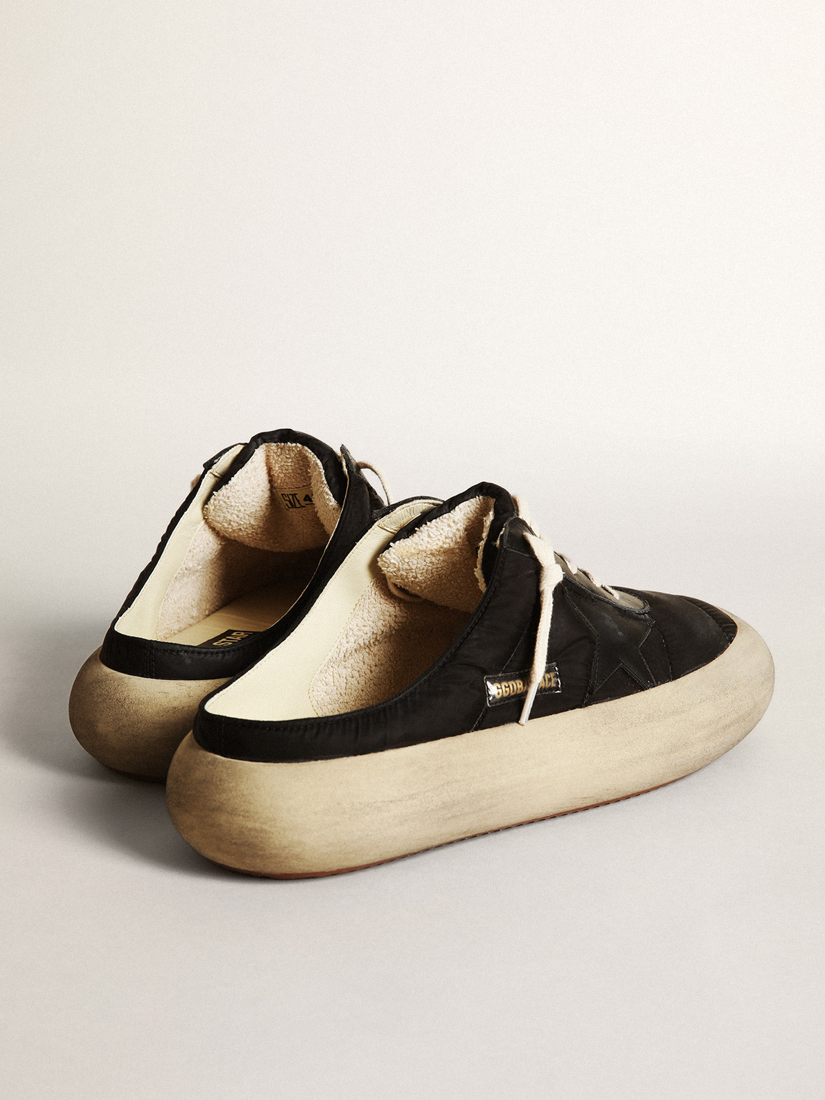Votre nouveau moment pour vous éloigner de la réalité et voler comme jamais auparavant. Enveloppé(e) dans cette incroyable sensation de légèreté dès la première seconde, pour révéler la version la plus audacieuse de vous-même. En libérant enfin votre style et votre esprit. Les Space-Star présentent une semelle à coussinet supplémentaire et une semelle intérieure rembourrée à mémoire de forme, qui garantissent un confort unique dès les premiers pas. Ces mules pour homme se distinguent par une tige en nylon noir, rehaussée d’empiècements en cuir noir, comme l’étoile, et par une doublure en cuir souple. Les lacets couleur crème complètent le style.