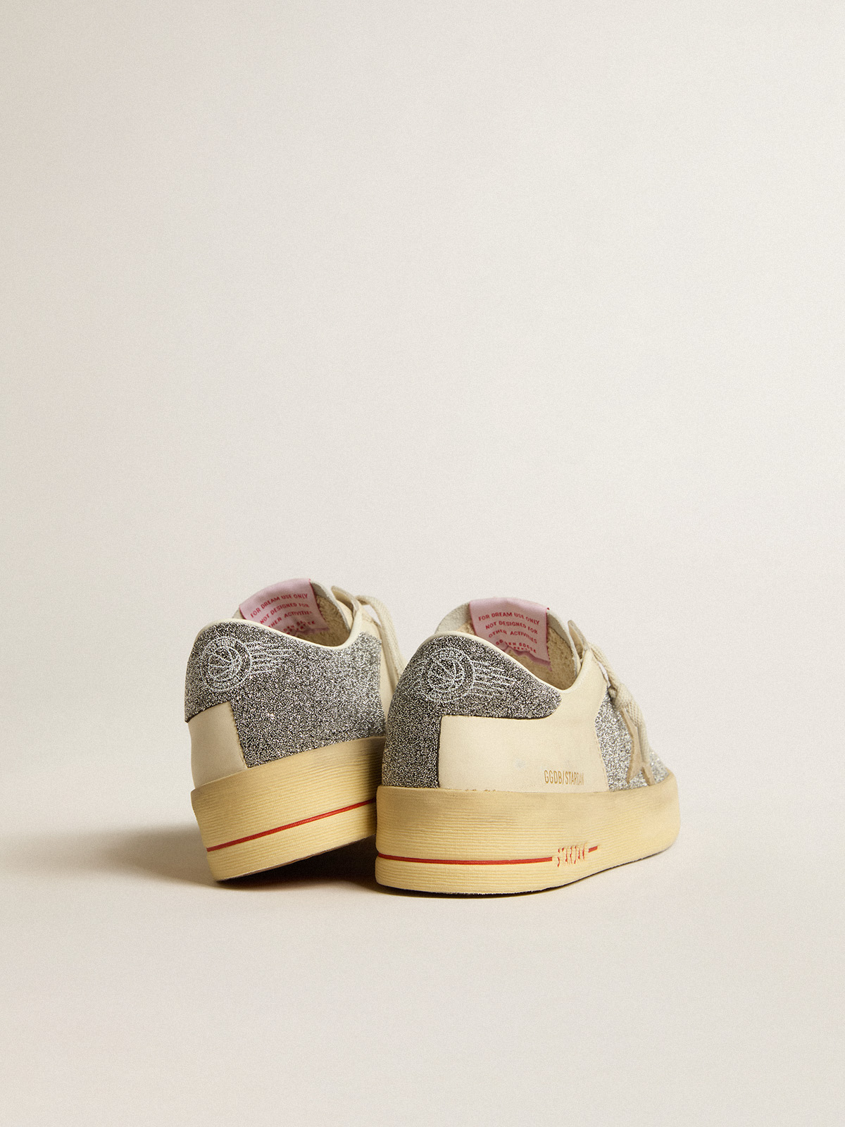 Créer un compteLes glorieuses années 1990 renfermées dans une paire de sneakers. Les Stardan sont un hommage aux icônes du basket-ball de cette décennie, tout en étant tournées vers le présent. Dotée d’une tige en daim blanc cassé, illuminée d’empiècements en petits cristaux Swarovski argentés, cette version pour femme se distingue par une étoile en daim couleur sable et par un contrefort rehaussé de petits cristaux Swarovski argentés. L’empiècement asymétrique à l’arrière en petits cristaux Swarovski argentés et les lacets blancs apportent la touche finale.