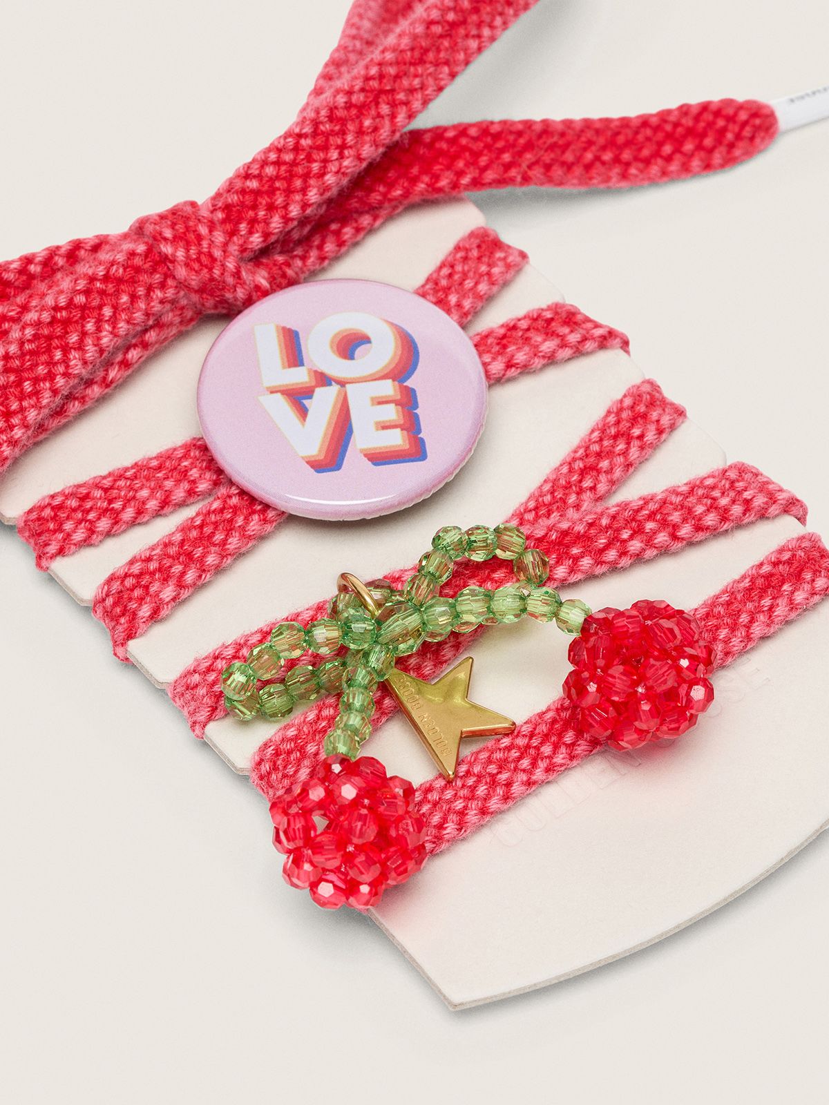 Create AccountCustomize your favorite sneakers with "Skins", our embellished laces, designed to express your unique style through accessories and colors that are sure to impress. This Playful model consists of thin red-colored laces, embellished with a pink pin and a cherry-shaped beaded charm. As a finishing touch, a gold-colored Golden mini star accompanies the cherry charm. The ideal accessory to let your personality shine.