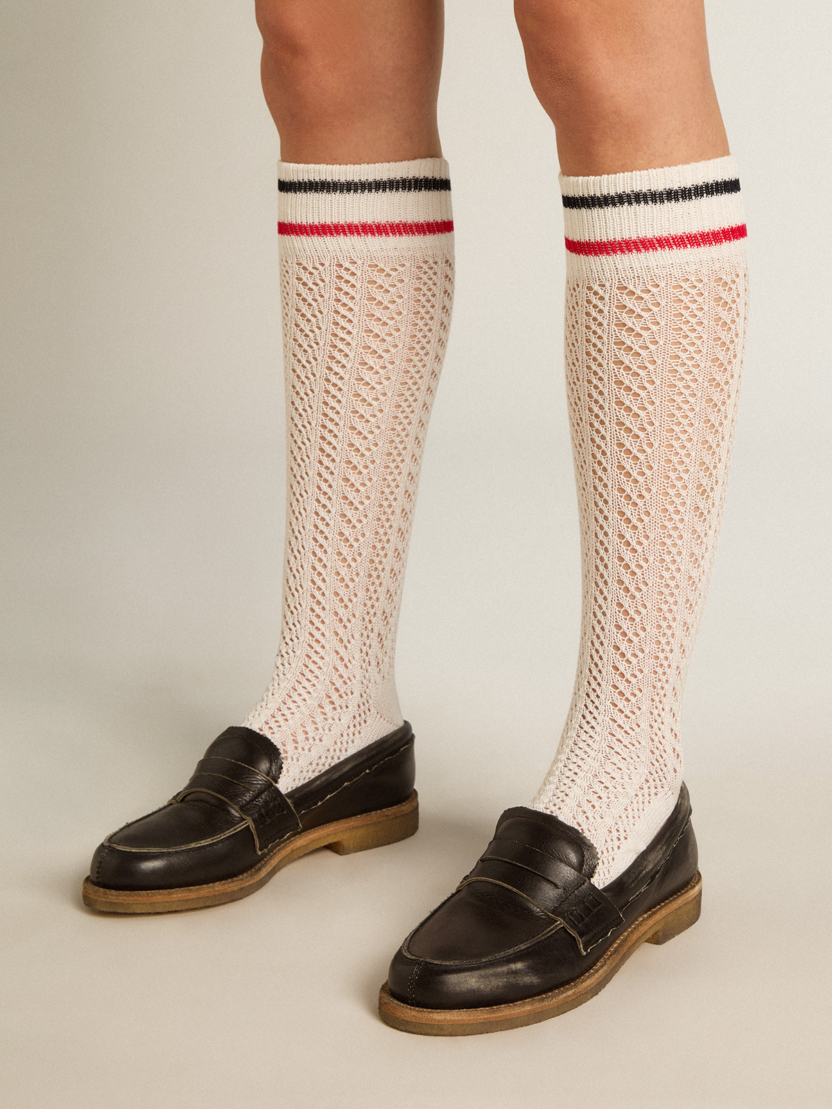 Create AccountA vintage feel and craftsmanship are some of our distinctive components: long ribbed socks in a vintage white version, featuring two-tone red and navy blue stripes.