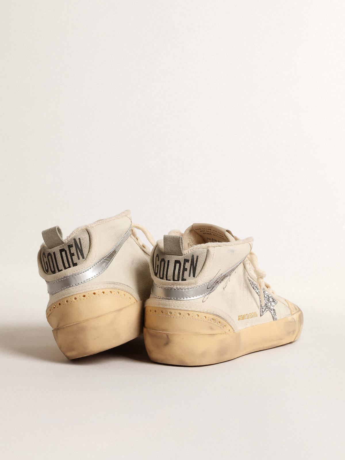 1990年代のスケートシーンにヒントを得ながら、より洗練されたデザインへと磨きをかけたMid Starスニーカー。個性的なエレガンスを魅力とし、幅広いシーンに対応します。このモデルはアッパーに白のレザーを使用しており、シルバーのグリッターの星と、マットな質感のシルバーのラミネートレザー製フラッシュで装飾されています。仕上げに、アイスグレーのスエード製ヒールタブと白のシューレースをあしらいました。