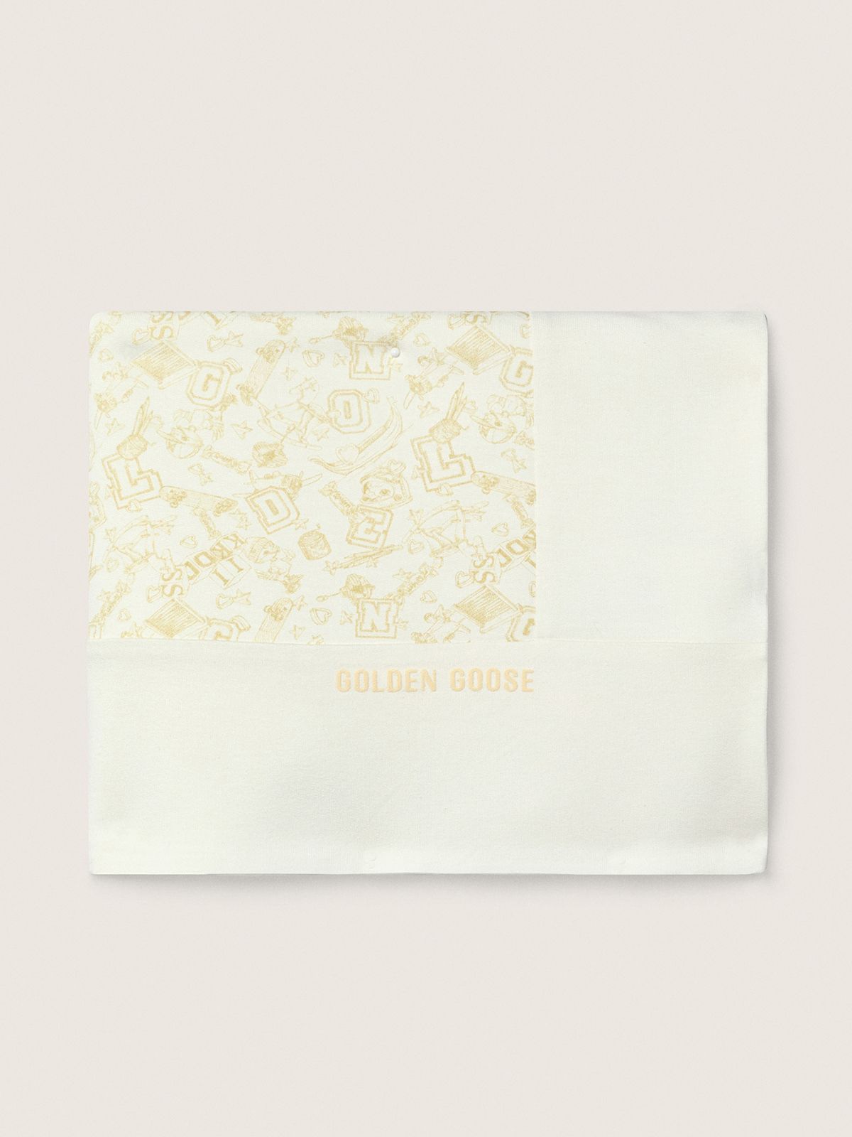 Create AccountA collection created to be by your side at all times, ready to accompany you on bright days and unforgettable adventures. Made of white cotton fleece, this baby blanket features an all-over peach-pink mascot print and a Golden Goose logo detail printed on the hem.