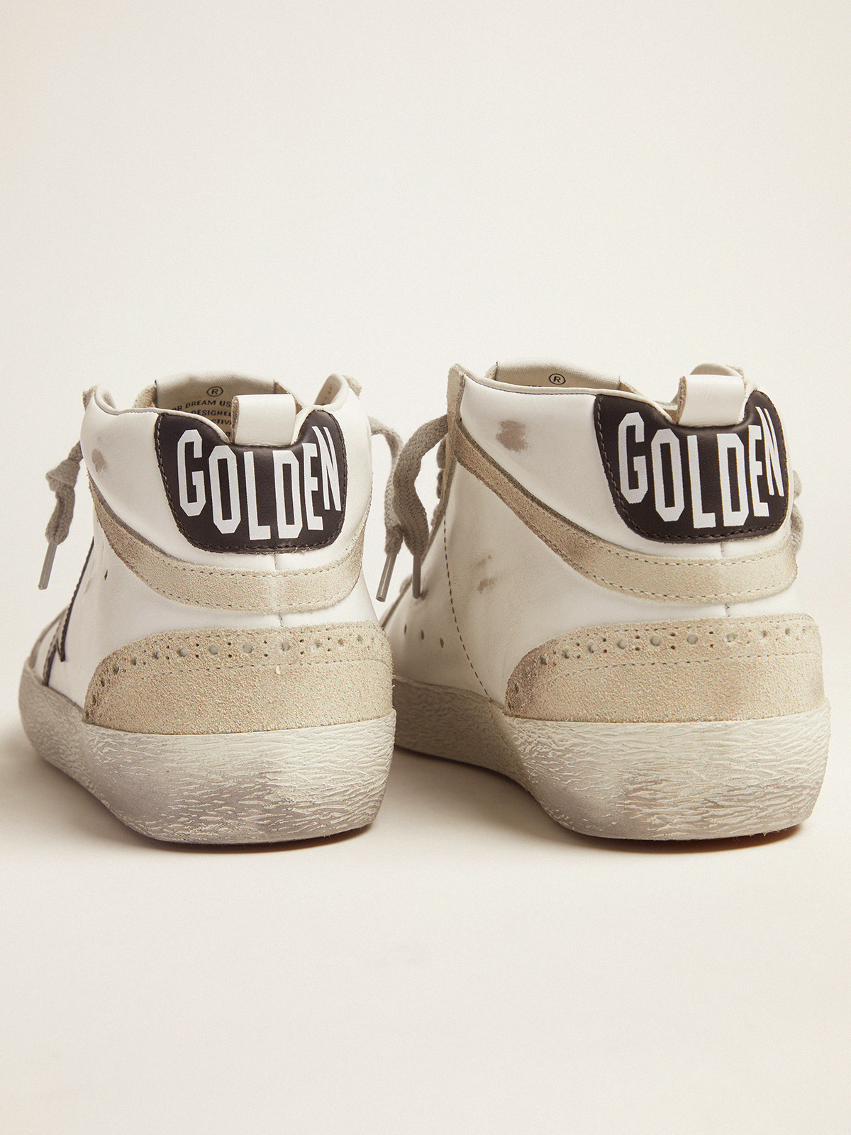 Create AccountA casual look exuding streetwear elegance: a model that interprets the Golden Goose style thanks to the use of exclusive treatments and finishes. These Mid Star sneakers feature a white and grey leather and suede upper and a black star.